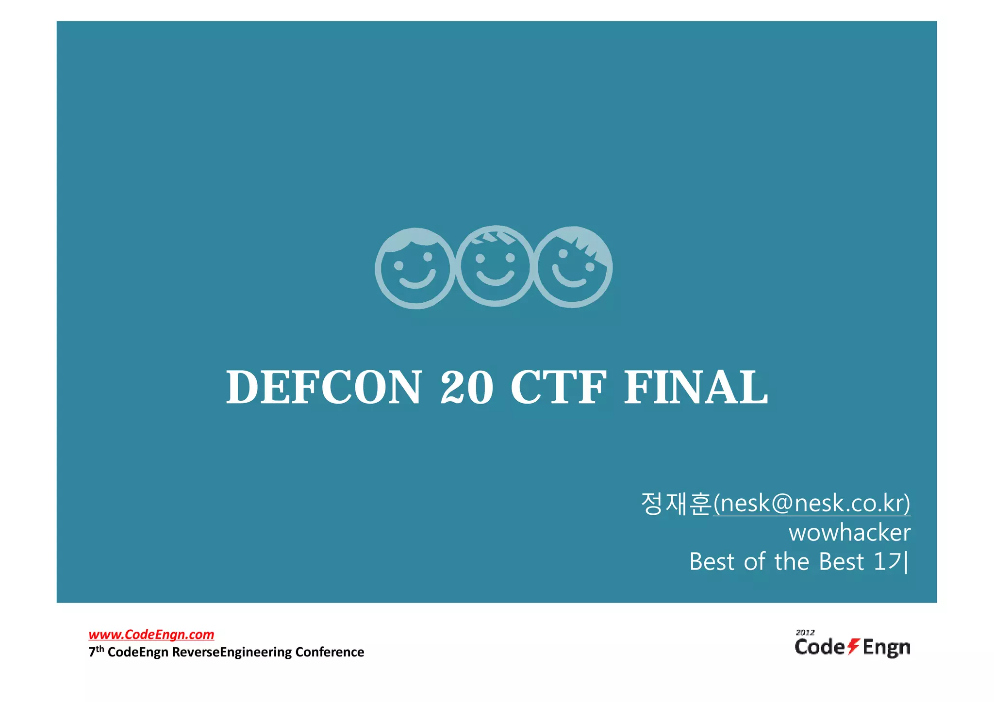 데프콘은 매년 라스베이거스에서 열리는 세계적으로 가장 권위 있는 보안 컨퍼런스 중 하나로 CTF 대회를 진행하고 있다. 올해 데프콘은 특히 20주년을 맞아서 20개팀이 본선에 참가하였으며, 다양한 문제들이 출제되었다. 보통 해킹대회에서의 예선전 풀이는 많지만 본선문제에 관한 정보는 많이 부족하기 때문에 CTF에 출제된 문제중 몇문제를 선정하여 풀이한다.