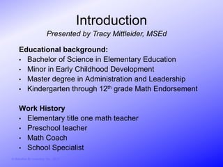 This document summarizes a presentation about overcoming math obstacles through visualizing with the AL Abacus. The presentation was given by Tracy Mittleider and was based on the work of Joan A. Cotter. It discusses Dr. Cotter's background and the development of the AL Abacus, a visual and tactile manipulative that helps develop mental images of quantities, strategies, and mathematical operations. It also provides examples of how the abacus can be used to help visualize quantities and perform simple addition.