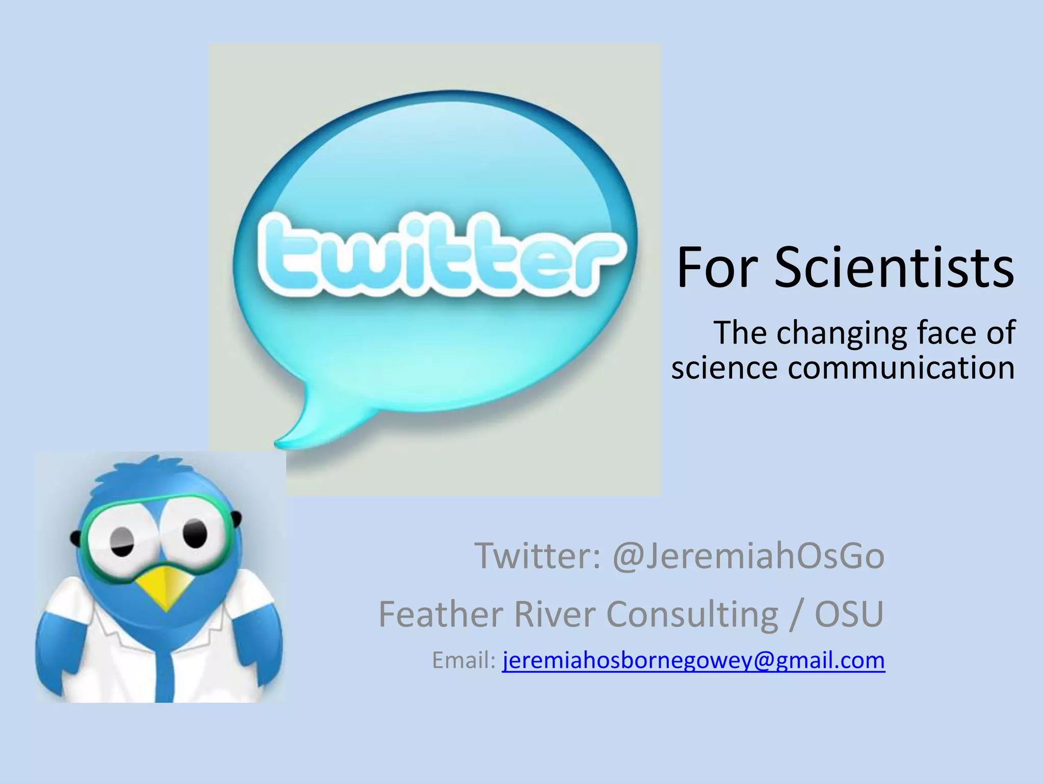 The document discusses using Twitter for science communication. It provides reasons to use Twitter such as for having conversations, building community, sharing news and information, enabling crowd-sourcing, and amplifying messages. It offers tips for what to tweet about including relevant news, research information and caveats, opinions, culture, and topics of typical conversation. The document also provides advice on when to tweet and tweet tips like knowing your audience and actively engaging with others on Twitter.
