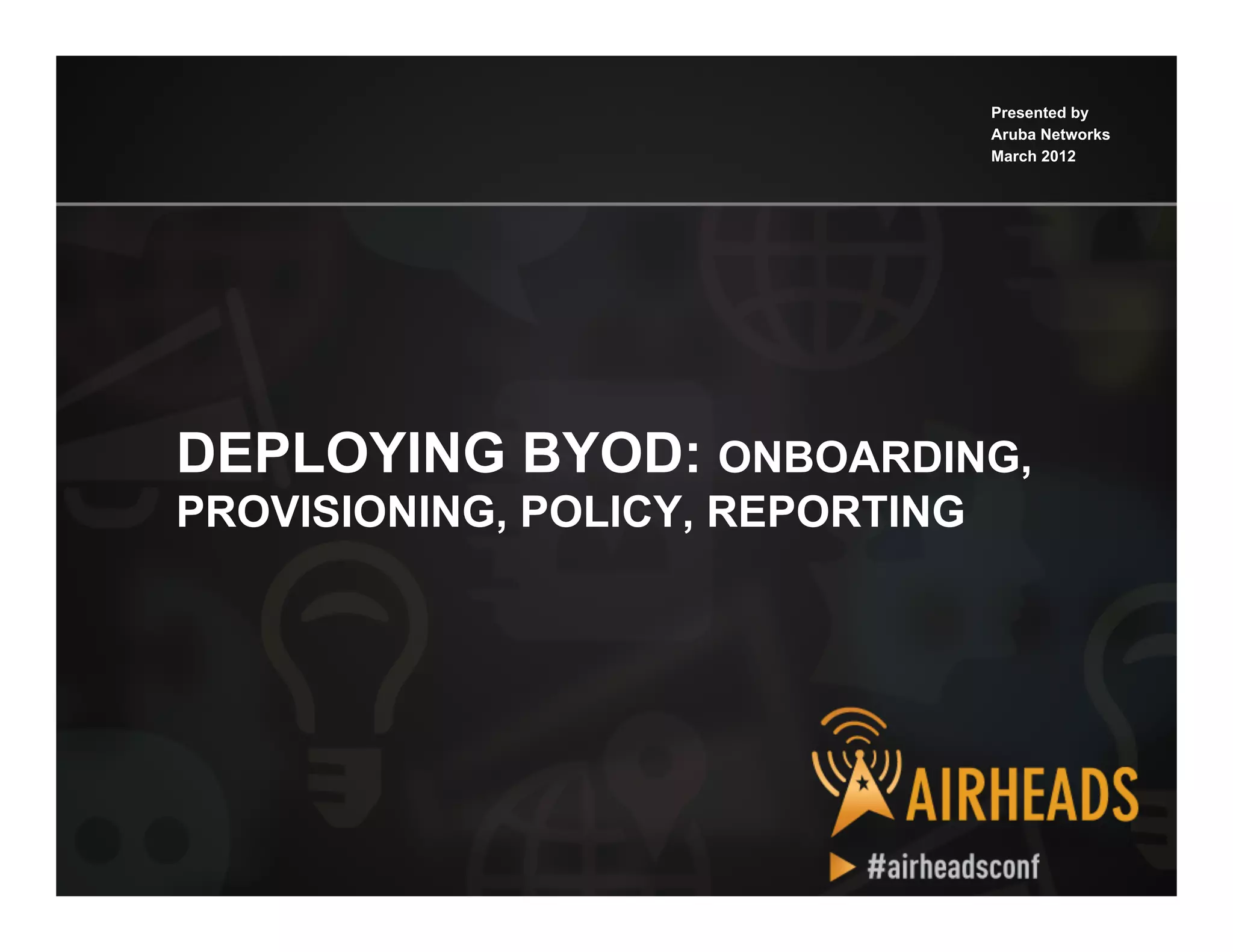 The document discusses how to securely onboard and manage personal devices on a corporate network through BYOD (Bring Your Own Device). It describes ClearPass for enabling network access for mobile devices by joining a BYOD domain, applying device access controls and visibility/reporting. ClearPass allows enrolling devices, provisioning credentials, linking users to devices, enforcing policies based on device/user attributes and revoking access when needed. The document provides examples of applying different access policies and network zones for executive vs employee devices like iPads, laptops and tablets.