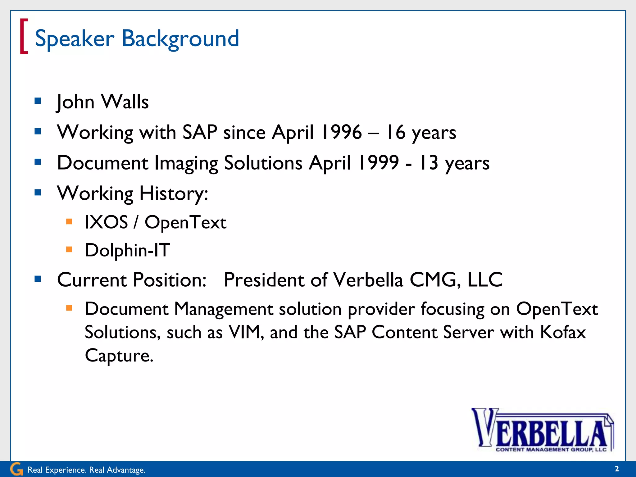 The document provides an overview of document imaging and the SAP Content Server. It discusses John Walls' background working with document imaging solutions. The agenda covers the advantages of a paperless office, typical system configurations, the SAP Content Server, common archiving scenarios including early and late archiving, printlists and outgoing documents, generic object services, and best practices for an imaging project. Common terms are defined, and the content server administration is demonstrated. The early and late archiving scenarios are explained in detail along with barcode archiving.