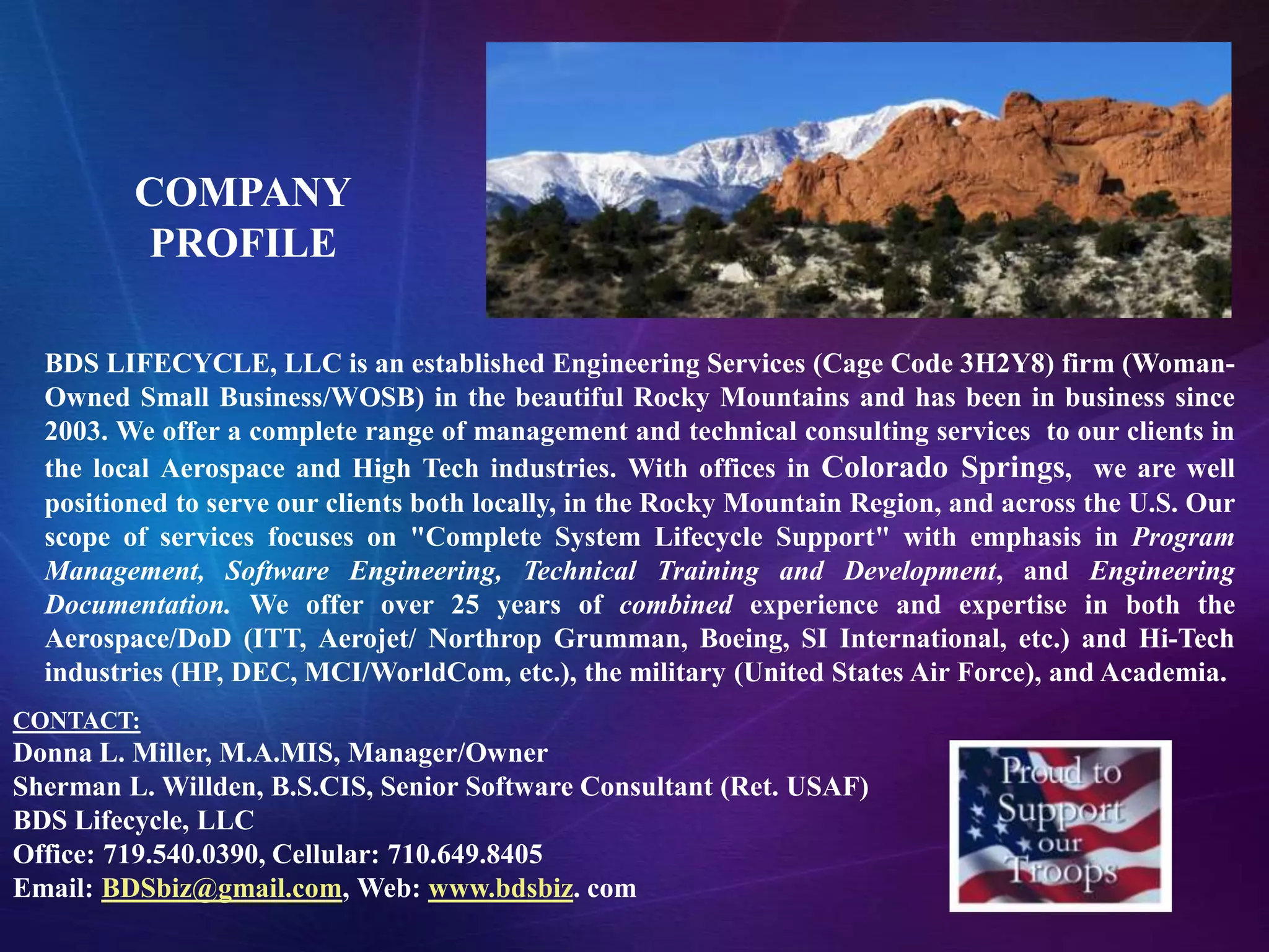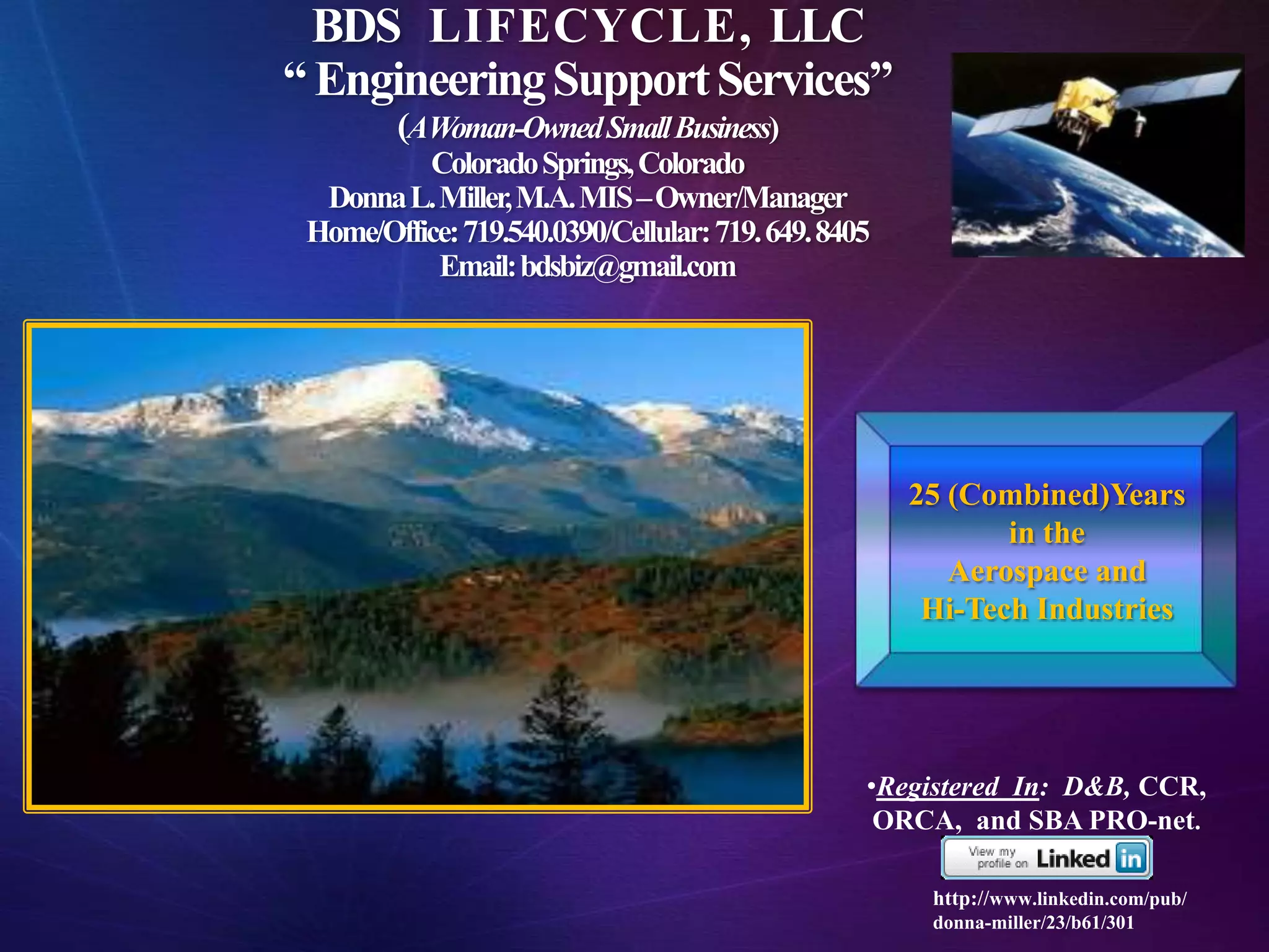 BDS Lifecycle, LLC is a woman-owned small business providing engineering support services based in Colorado Springs, CO. With over 25 years of combined experience in aerospace, defense, and high-tech industries, they offer a range of program management, software engineering, technical training, and documentation services to support clients' complete system lifecycles from concept through production and operations. Their mission is to identify critical success factors, manage risk, implement process improvement, and ensure customer satisfaction on projects.