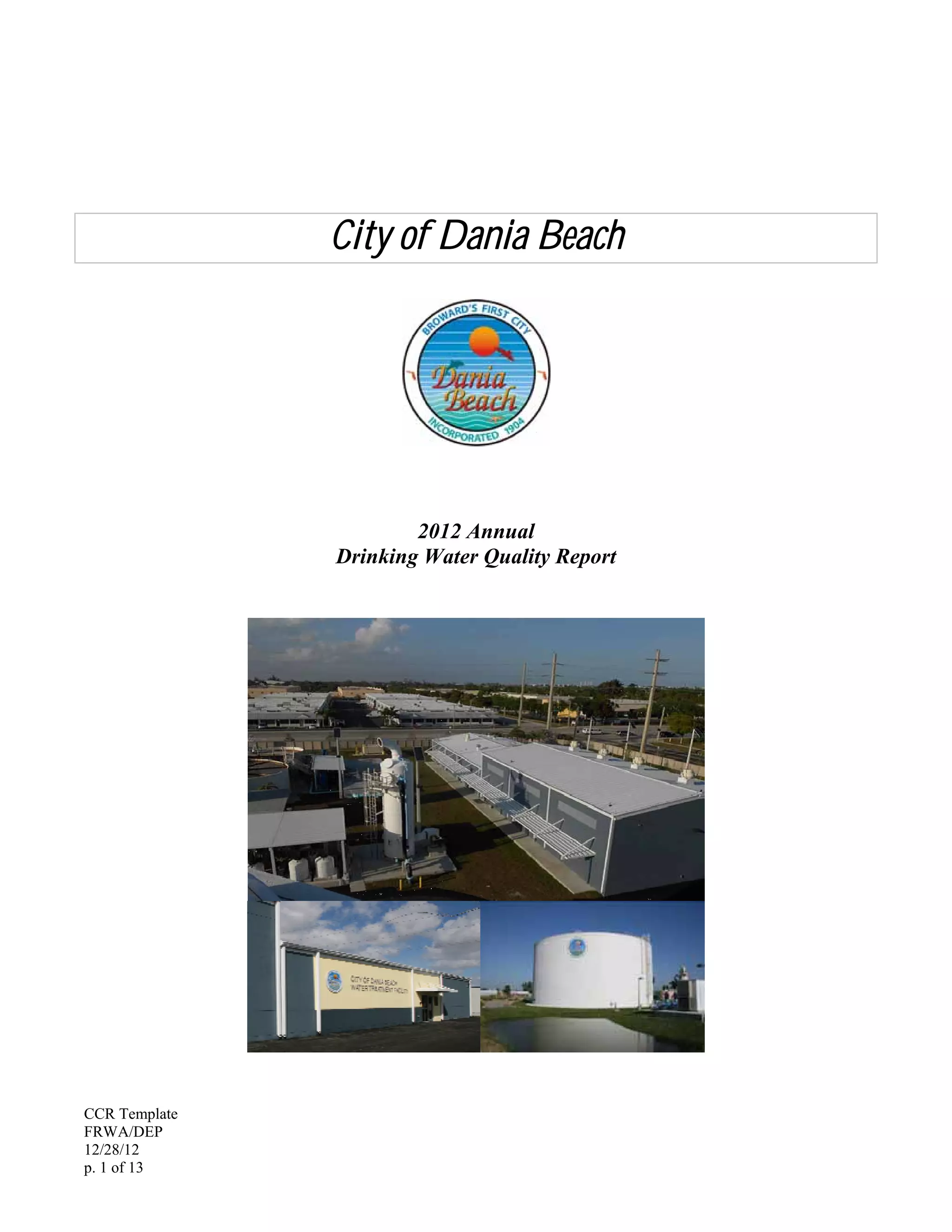 The City of Dania Beach routinely monitors its drinking water supply and submits reports on water quality. Testing in 2012 found the water safe within regulatory limits, except the City failed to complete all required lead and copper sampling between July and December. The water source is underground aquifers accessed by wells 65 feet deep. Water is treated through lime softening, filtration, disinfection and fluoride addition. About 17,000 customers receive water meeting health standards, though some groups may be at higher risk and should take precautions.