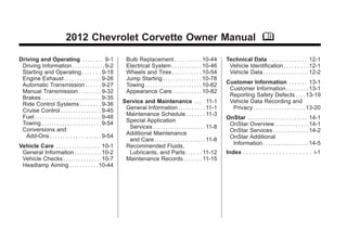 The 2012 Chevrolet Corvette owner manual provides essential information on vehicle features, maintenance, and safety. It covers topics including initial driving information, seating and restraint systems, lighting, and infotainment systems, along with warnings and cautions for safe operation. It also details vehicle customization options and maintenance schedules for optimal performance.