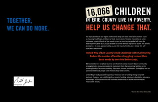 United Way of Erie County has declared a bold goal to reduce the number of families struggling to meet basic needs by one-third by 2025. To achieve this, their strategy focuses on connecting families to education, income, and health resources. They will convene partners from various sectors to achieve goals in these areas. Key initiatives include Erie Together, which aims to reduce poverty through collaboration, and Erie Vital Signs, which will monitor community progress on key issues over 10 years. United Way also aims to implement a 2-1-1 system to better connect people to essential services.