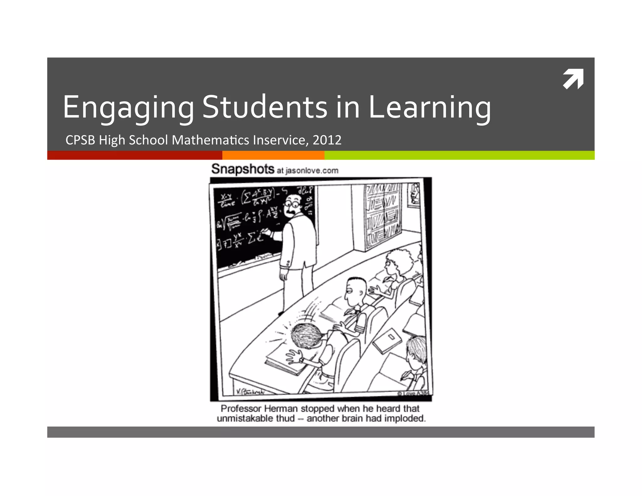 The document discusses strategies for engaging students in mathematics learning. It begins by outlining instructional objectives and classroom management techniques. It then describes activities teachers can use to actively involve students, such as the Marshmallow Challenge problem solving activity, Mix-N-Match pairing activity, Line-Ups ranking activity, and Inside-Outside Circle discussion format. The goal is to strategically use questioning, discussion, and hands-on challenges to maximize learning for all students.