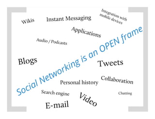 The document discusses essential questions and strategies for establishing an effective online presence, focusing on communication tools like blogs, social media, and email. It emphasizes the importance of planning, choosing the right tools, assigning responsibilities, and setting clear goals for community engagement and feedback. Additionally, it highlights the potential barriers to communication and the need for regular evaluation of goals and strategies.