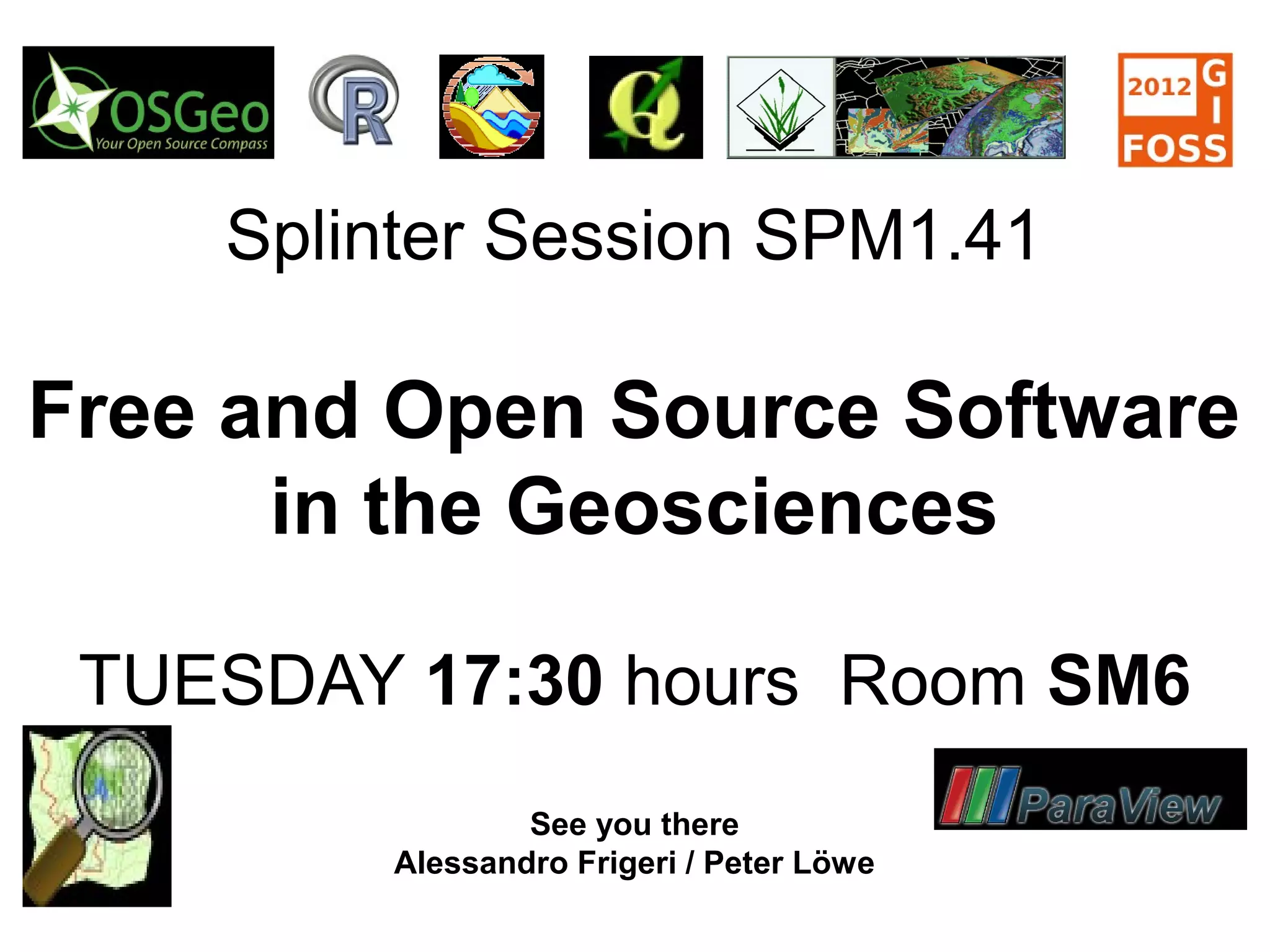 This document summarizes a presentation about using free and open source software (FOSS) in geoscience. The presentation will take place at the EGU conference on Tuesday at 17:30 in room SM6. The presenters will discuss how scientists use and contribute to FOSS tools to conduct research, communicate findings, and extend existing tools for new applications. They will also discuss ideas to better recognize and support the role of FOSS in scientific work, such as establishing a FOSSIS session at EGU to highlight technical FOSS solutions or awarding a prize for innovative FOSS use. Attendees will be invited to introduce themselves and their fields of science and FOSS tools.
