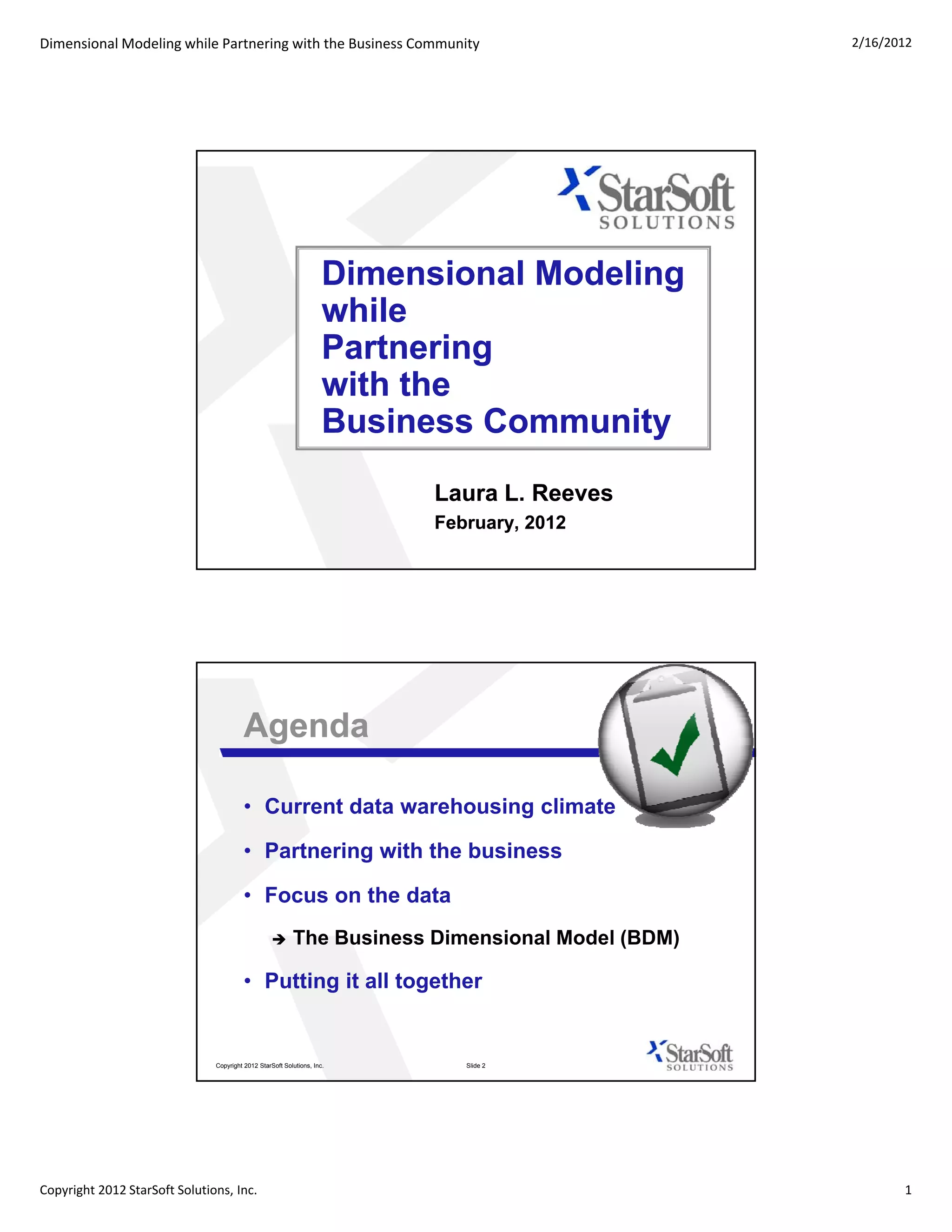 The document discusses dimensional modeling and partnering with the business community for data warehousing. It emphasizes the need to partner closely with business users to understand their needs and goals in order to build effective data warehouse solutions. It also stresses the importance of communication, collaboration, continually learning new skills and cultivating problem solvers within the IT team to strengthen the partnership between IT and the business.