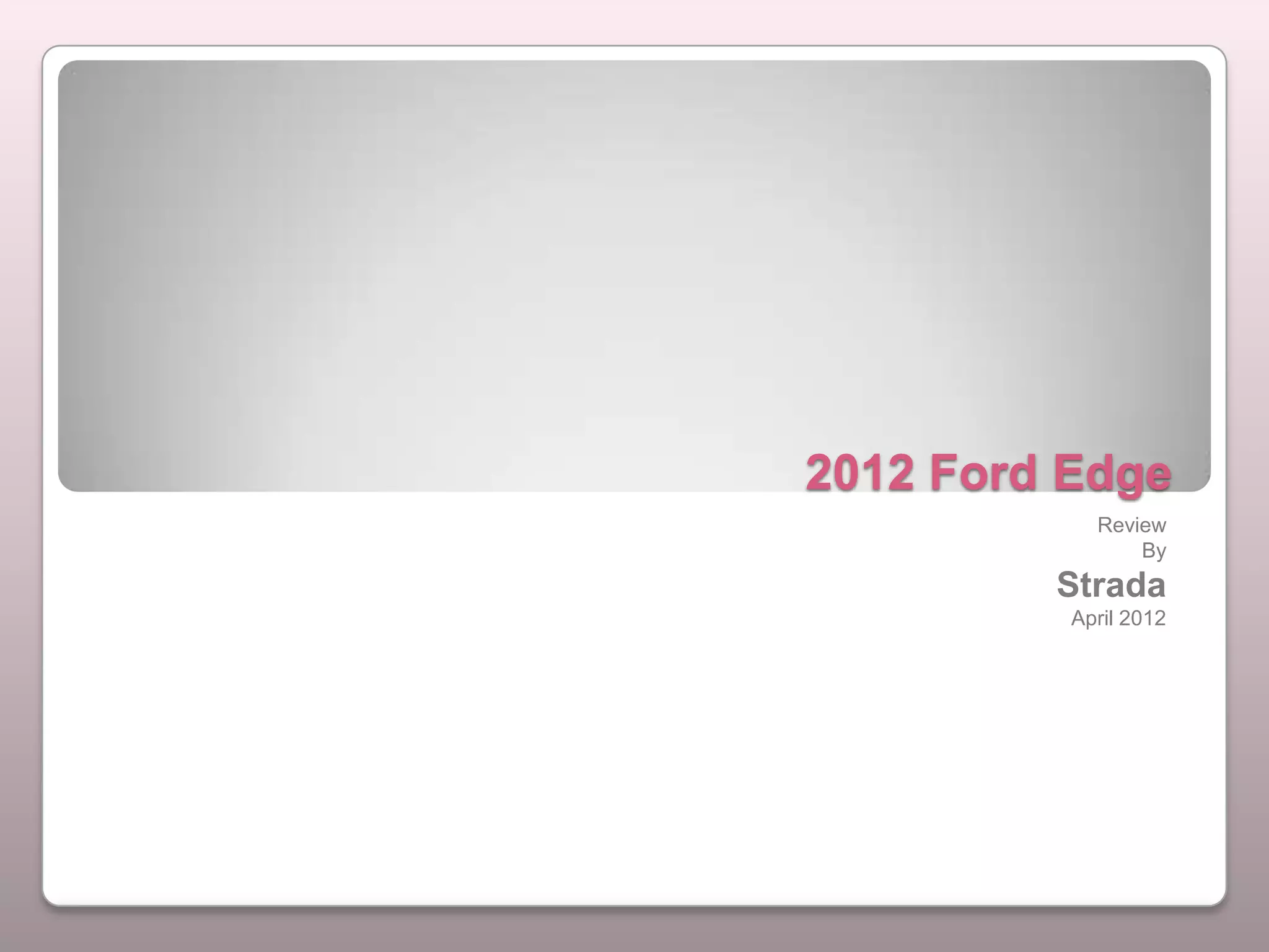 The 2012 Ford Edge receives a positive review for its pleasing styling with a distinctive grille and LED lights that contribute to its cool factor. The interior offers nice features like leather seats and contrast stitching. It has intuitive controls and adjustable interior lighting. The Edge provides excellent legroom and a useful cargo area with folding seats and power tailgate. It delivers reasonable and expected performance from its 240HP engine, with smooth shifting, good steering and braking over rough roads, inspiring confidence in the driver.