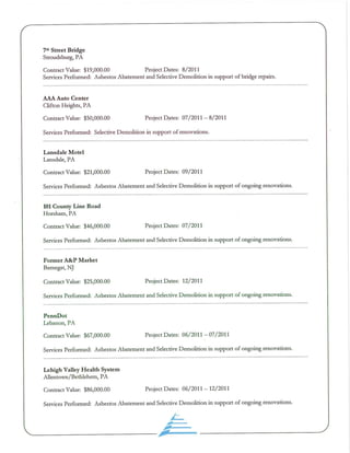 This document provides information about an environmental services company called Alliance Environmental Systems. It discusses their services including asbestos abatement, indoor air quality services, hazardous materials remediation, structural demolition, and budgeting/estimating. The company aims to provide experienced, licensed professionals and comply with all applicable regulations across different market sectors.