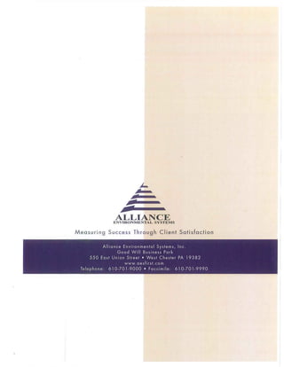 This document provides information about an environmental services company called Alliance Environmental Systems. It discusses their services including asbestos abatement, indoor air quality services, hazardous materials remediation, structural demolition, and budgeting/estimating. The company offers licensed professionals, state-of-the-art equipment, and strict compliance with regulations for environmental projects across various markets.