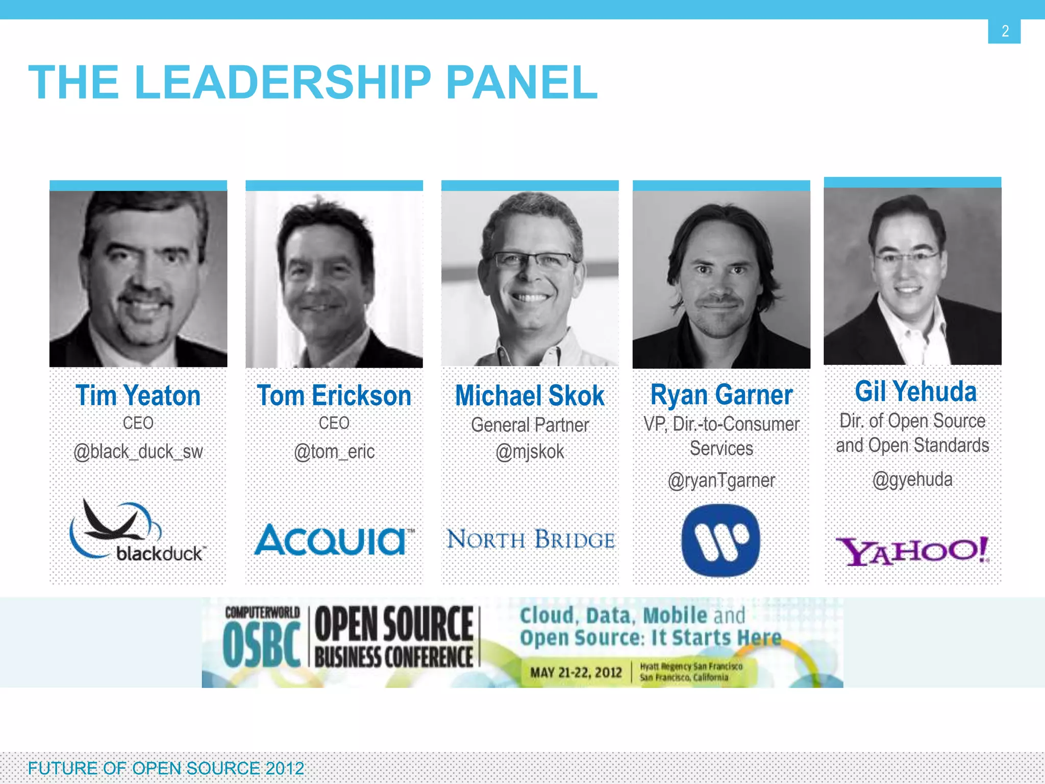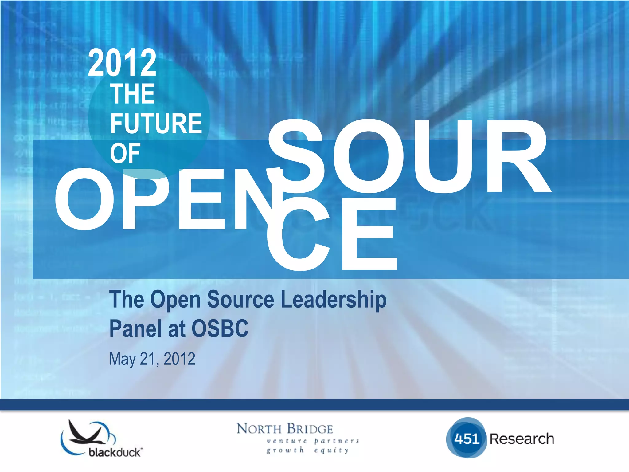The document summarizes a panel discussion on the future of open source software. It discusses trends showing that open source adoption is growing rapidly and expected to make up over 75% of deployed software within 5 years. Open source is gaining popularity due to lower costs, freedom from vendor lock-in, and other factors. Industries like data management, healthcare, and financial services are most impacted by open source. The mobile space is seeing huge growth in new open source projects. Investment in open source startups is also increasing significantly.