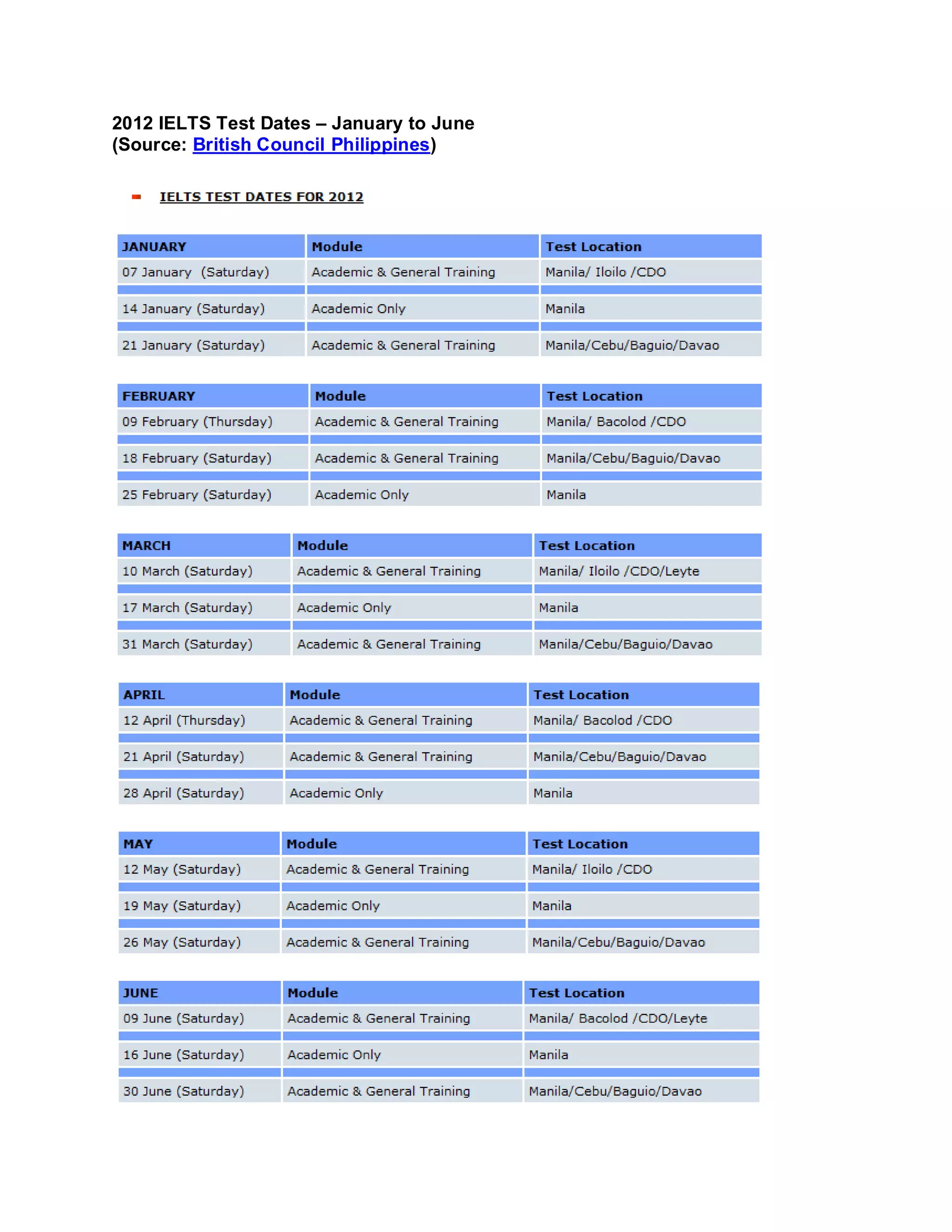 The document provides IELTS test dates from January to June 2012. It lists the specific dates that the International English Language Testing System (IELTS) exam will be administered in the Philippines during the first half of the year. Key dates include January 7th and 28th, February 11th and 25th, and March 10th and 24th.