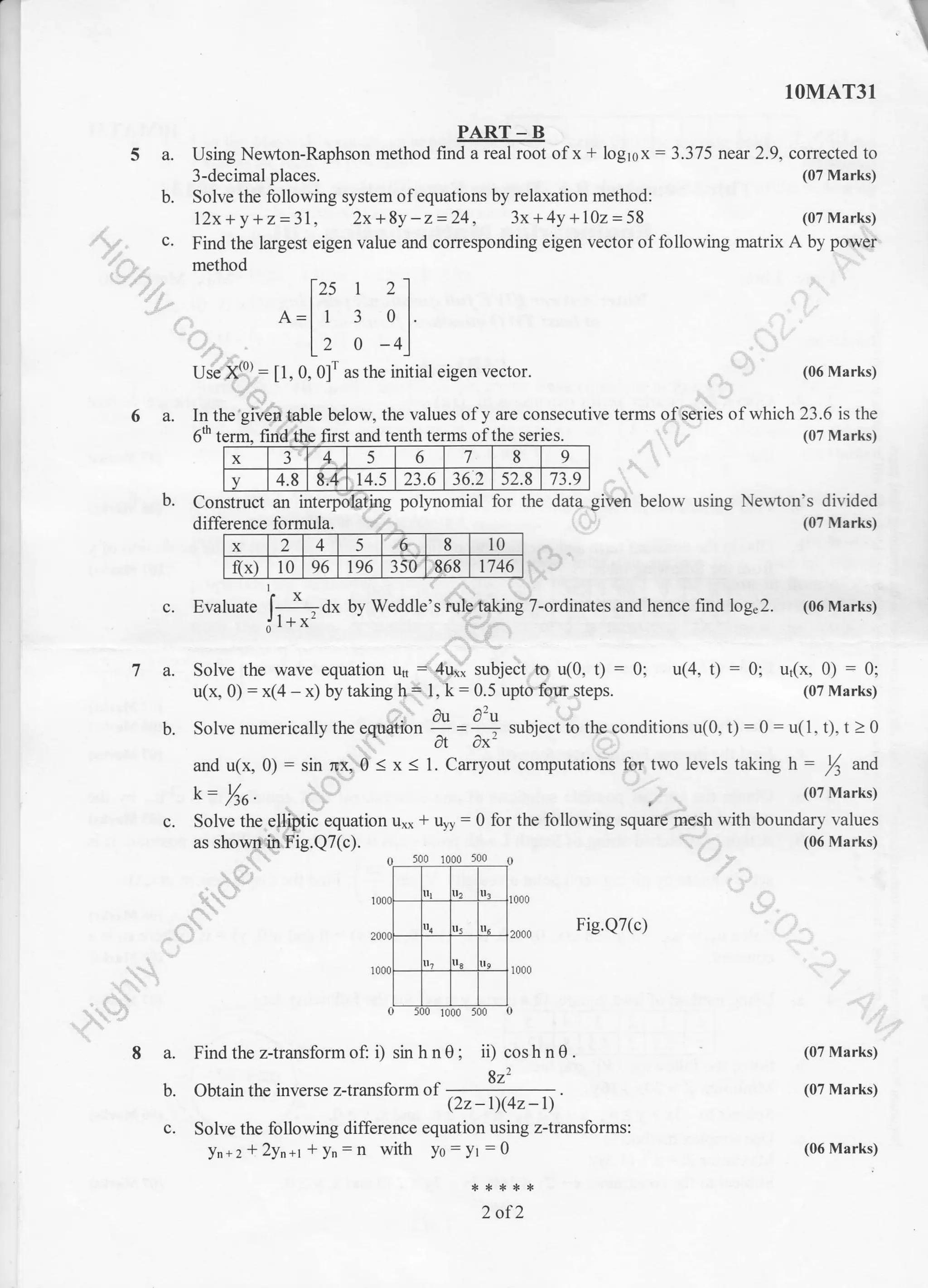 The questions assess concepts related to network analysis including Fourier series expansion, Fourier transforms, Laplace transforms, solution of differential equations using separation of variables, curve fitting, eigen analysis, and more. Methods like Newton-Raphson, simplex method, relaxation method, and power method are also tested. Circuit analysis concepts involving RC circuits, transfer functions, and network theorems are covered.