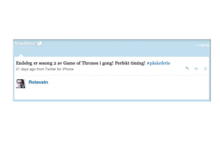 #6 I fjor sommer prøvde han å få tak i GoT lovlig. I år har han kapitulert. Ikke mye er skjedd siden i industrien siden. Riktignok NRKBeta med ny Player (24.4) Men de er ikke avhengig av forretningsløsninger, lønnsomhet eller inntjening. De spiller på lag med de nye seerne – og har skapt en god brukervennlig platform. Hvilket community/samseeing/relasjonsbygging mellom seerne ut fra dette tilbudet, vil være interessant å følge. For å lære mest mulig om sosiale seervaner og some som egen platform.