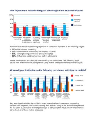The 2012 mobile forecast for higher education highlights the significant role of mobile technology in student, prospect, and alumni engagement, particularly among millennials. Survey responses from over 500 university administrators reveal that a majority see mobile as fundamental in recruitment, retention, and community building, with many institutions planning to enhance mobile strategies in the coming years. The findings indicate that college personnel need to understand differing mobile usage patterns between themselves and their students to ensure effective communication and engagement.