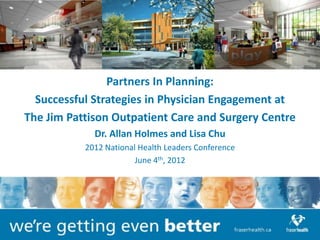 The document summarizes strategies used for physician engagement during the planning and development of the Jim Pattison Outpatient Care and Surgery Centre (JPOCSC) in Surrey, British Columbia. Six key strategies were used: 1) designating physician co-leads, 2) creating a physician integrated lead council, 3) partnering physicians with operational engineers, 4) optimizing communication to physicians, 5) creating a bilateral statement of expectations, and 6) designing and implementing a comprehensive physician education, training and orientation program. These strategies helped ensure physician buy-in and a successful opening of the new facility on June 1, 2011.