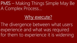 The document discusses building a Project Management Information System (PMIS) tailored to specific organizational needs, emphasizing collaboration, communication, and stakeholder engagement. It outlines the current challenges in project management, such as chaos and internal alignment, and proposes utilizing tools like SharePoint and Microsoft Office for improved project management efficiency. The material includes various demonstrations on managing projects and enhancing transparency through technological solutions, targeting different maturity levels in organizations.