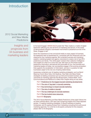 The document discusses predictions for social marketing and new media trends in 2012 from over 34 business and marketing leaders. Key predictions include: 1) Marketers will need to react in real-time and embrace social business evolution. 2) Integration of social data and marketing tools will be important, as will measuring influence and optimizing approaches to social media. 3) Mobile and the role it plays in social will be a major focus, and location-based targeting will increase. 4) Brands will demand better metrics and measurement of social media ROI.