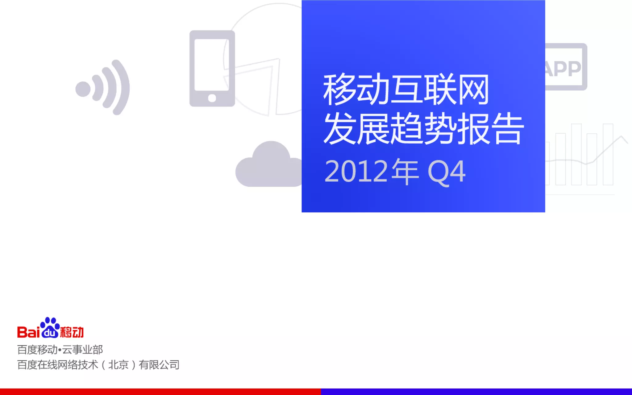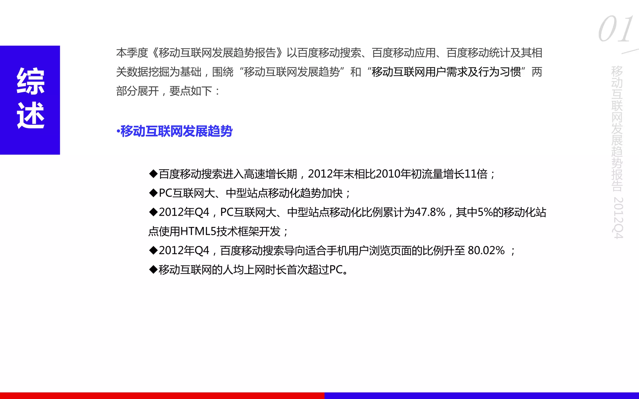 本季度《移动互联网发展趋势报告》重点分析移动互联网的增长趋势和用户行为习惯。报告指出,百度移动搜索在2012年末的流量增长达11倍,移动互联网用户的上网时长首次超过PC互联网,同时用户需求主要集中在阅读、购物和工具服务等方面。移动搜索用户对native app的需求则集中在工具服务和游戏类应用。