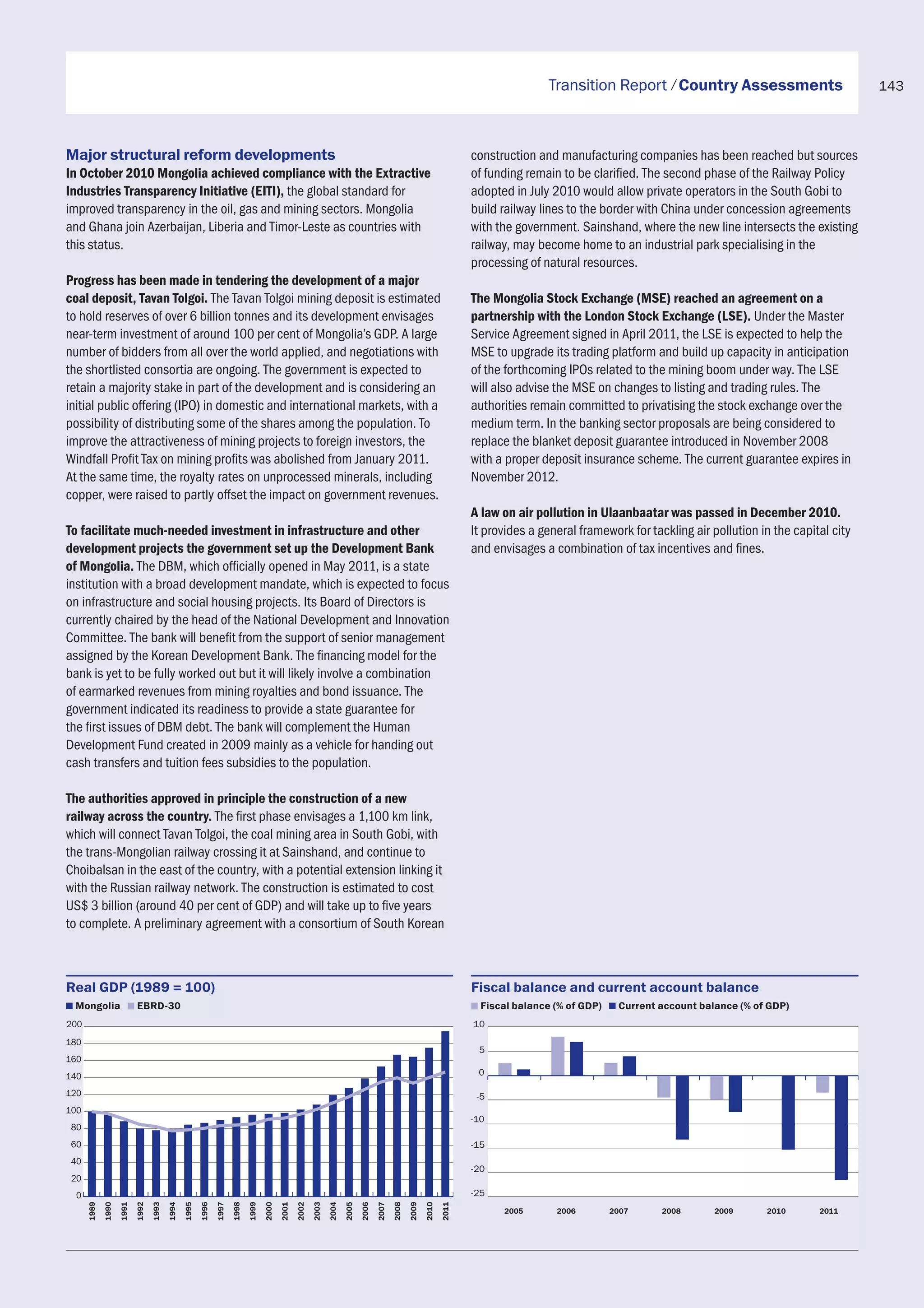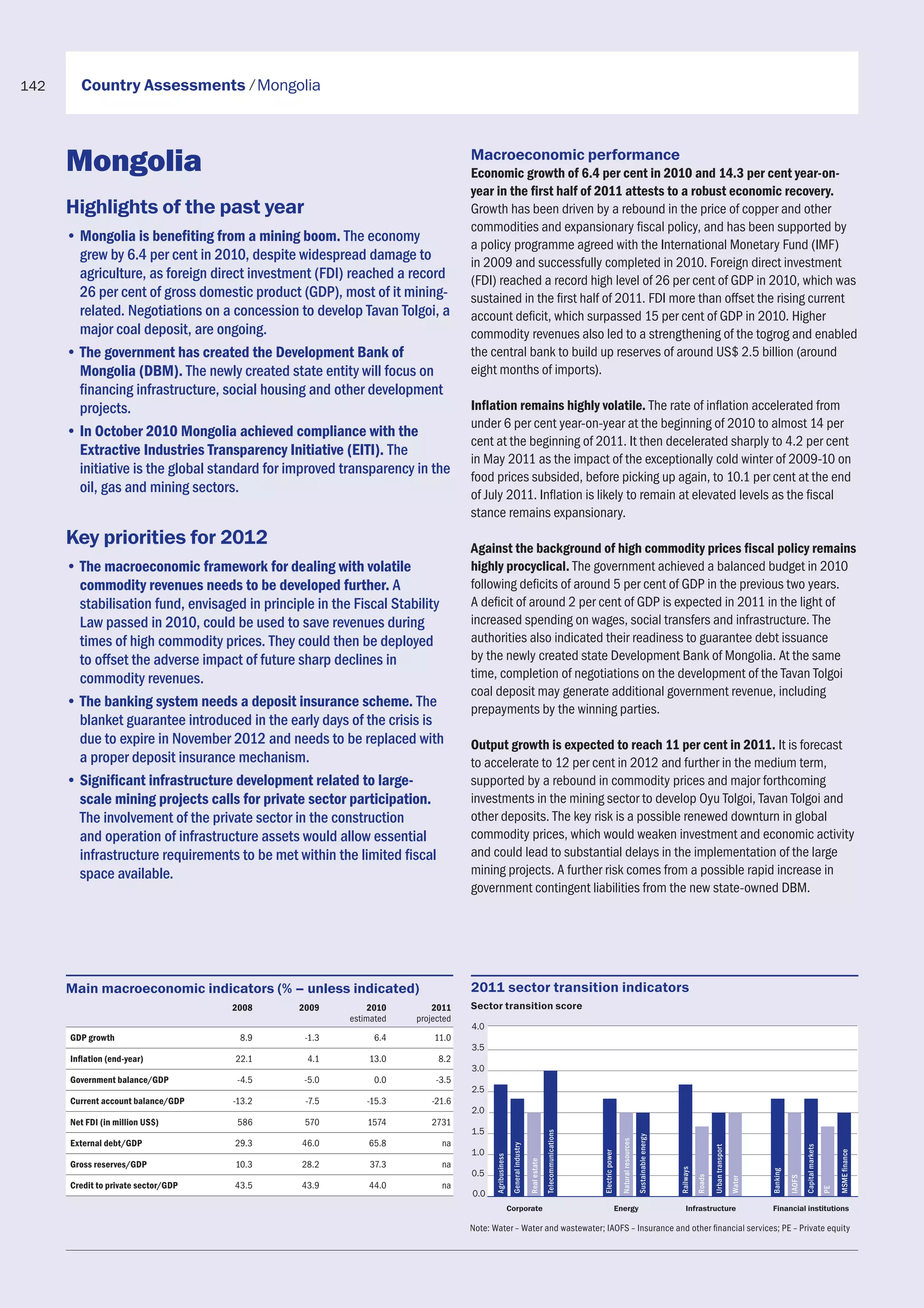 - Mongolia experienced strong economic growth of 6.4% in 2010 and growth is projected to reach 11% in 2011, driven by a mining boom and high commodity prices. Foreign direct investment reached a record 26% of GDP in 2010, mostly in mining.