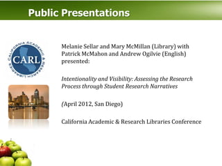 1) Four presentations given at various conferences on topics like student research narratives and millennial characteristics.