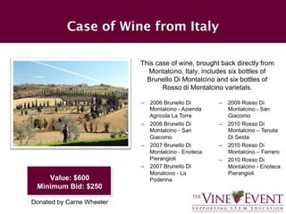 - A case of wine from Italy including Brunello and Rosso di Montalcino varieties.