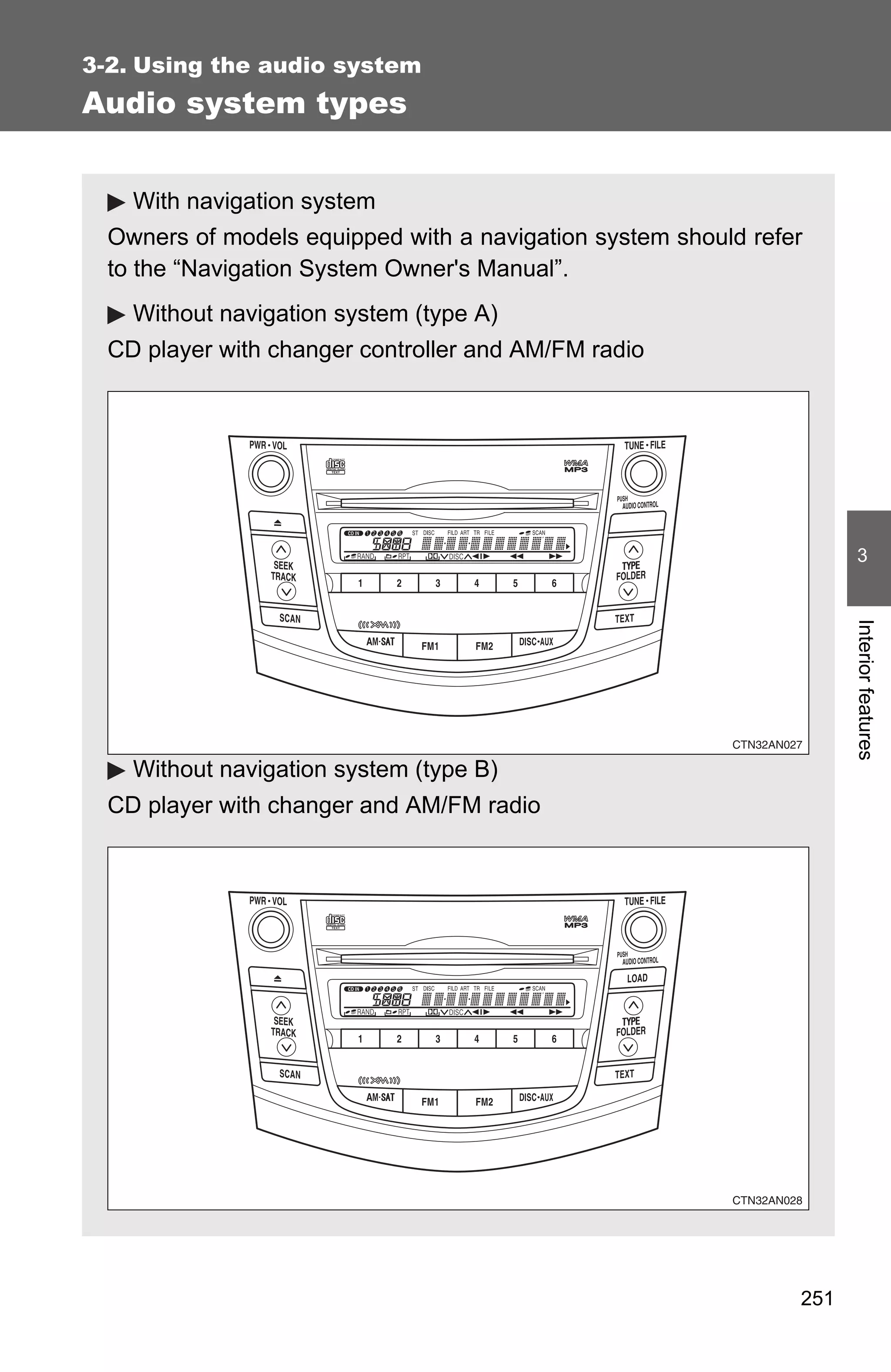 The document provides detailed instructions on utilizing various audio systems in vehicles, specifically focusing on navigation-equipped models and different CD player types. It covers essential features such as using the radio, playing CDs and MP3/WMA discs, along with cautionary notes on potential issues. Additionally, it includes troubleshooting tips for XM® satellite radio and guidelines for preserving audio equipment functionality.
