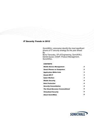 In 2012, significant IT security trends were identified, driven by the rise of mobile devices, increased cyber warfare, and evolving data protection practices. Key trends include the adoption of mobile device management, recognition of smartphones as handheld computers, and the rise of cloud computing which has led to commoditization and security consolidation. Companies must adapt their IT strategies to address new security challenges associated with these trends to mitigate threats and protect sensitive data.