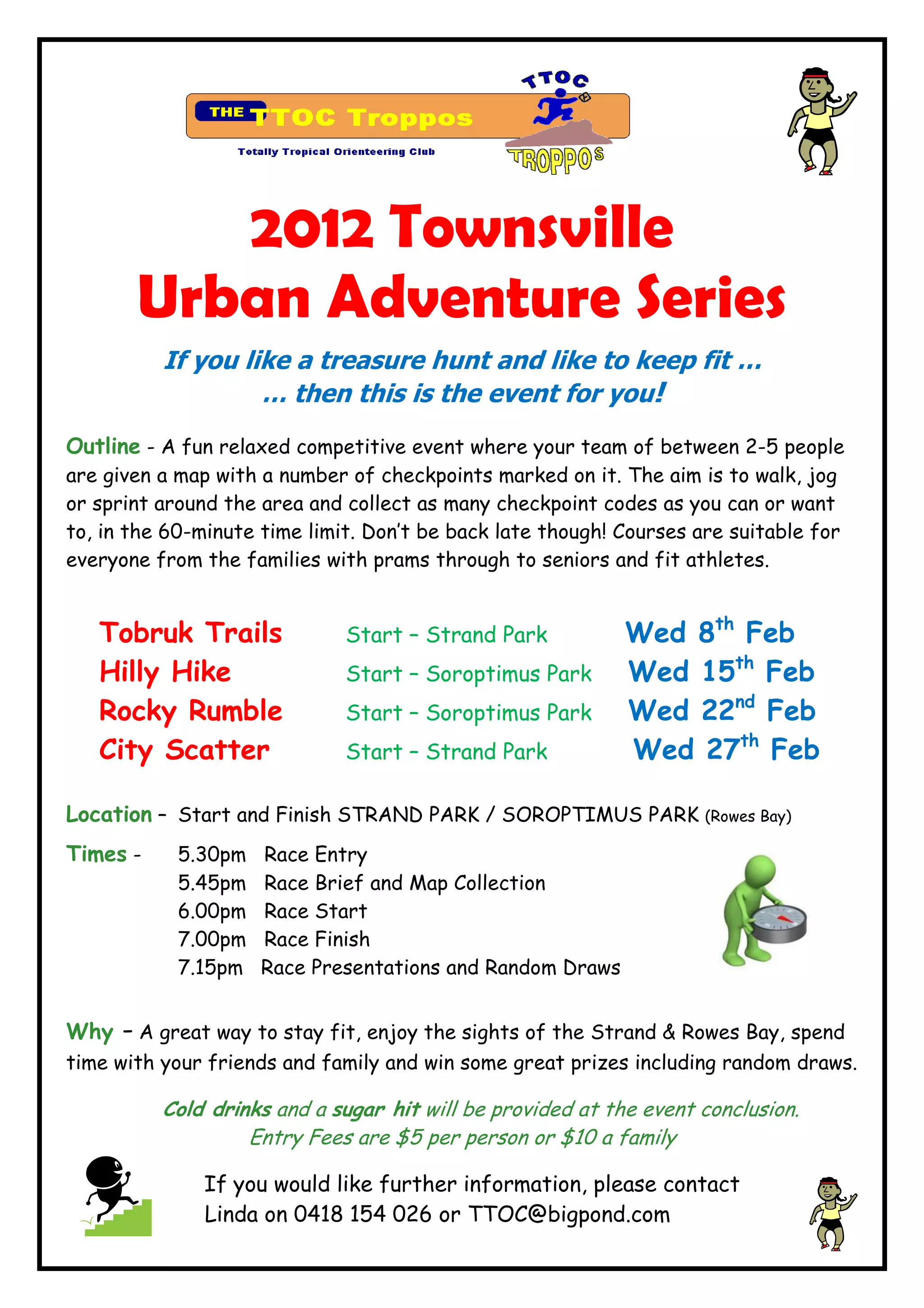 The document advertises an urban adventure series in Townsville consisting of 4 treasure hunt style races held on Wednesdays in February 2012 where participants are given maps and have 60 minutes to visit checkpoints marked on the map while jogging or walking around Strand Park and Soroptimus Park, with the goal of collecting as many checkpoint codes as possible. The events are suitable for a wide range of ages and fitness levels and provide prizes and refreshments at the conclusion.