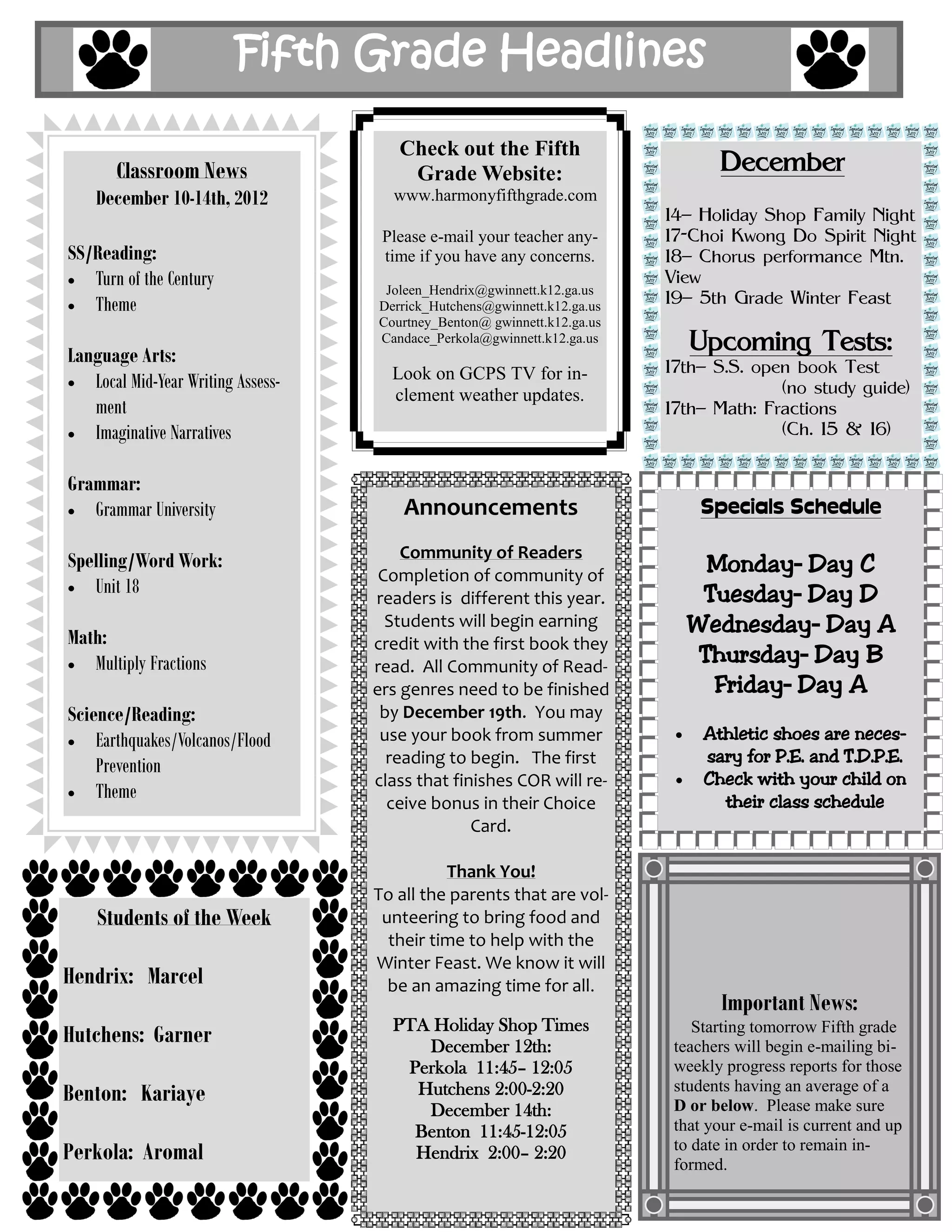 2) It includes information about upcoming tests, specials schedules, the completion deadline for the community readers program, and times for the PTA holiday shop.