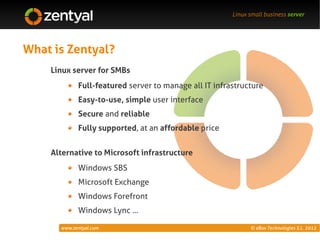 Zentyal is a Linux-based server solution for small and medium-sized businesses that provides all necessary IT infrastructure functions in an affordable and easy-to-use package. It offers full-featured server capabilities like network security, user management, communication services, and more. Zentyal can replace separate Windows servers for tasks like file sharing, email, and collaboration. It is supported by a global network of certified partners who provide installation, support, and other services to customers.