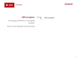 The document discusses the emergence of local liquidity and financing in Russia. Since 2009, the Central Bank of Russia has stimulated local capital markets by providing liquidity support, which has enabled Russian companies to access reasonable borrowing rates through various debt instruments. This has attracted other investors and allowed banks to increase lending. As a result, major Russian companies can now access credit locally when Western markets are constrained. The Central Bank influences interest rates and the economy by managing its balance sheet and refinancing operations.