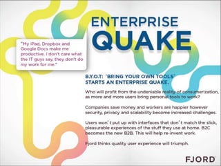 本文件探讨了信息人员在现代科技环境中的价值提升,并强调了云计算、移动应用、社交网络等技术趋势对企业的影响。它还提供了多种云端和社交媒体工具的应用实例,以提升学习效果、工作效率和降低成本。此外,信息人员需掌握多项技能,以应对未来可能面临的挑战与机会。