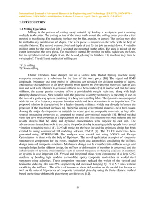 The document discusses composite materials for use in machine tool beds to reduce vibrations during machining operations. It presents an experimental study comparing the vibration response of machining two composite materials - glass fibre epoxy and glass fibre polyester. The results show that with an optimum number of composite layers, vibrations can be decreased significantly. However, more than the optimum number of layers causes an abrupt increase in vibrations. Effective damping is achieved when the composites are properly fixed to the bed and workpiece to avoid additional slip vibrations. Damping ability is higher when the matrix phase density is lower for the same fibre phase.