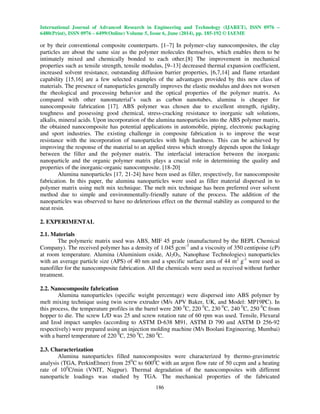 The document investigates the effect of alumina nanoparticles on the mechanical and wear behavior of reinforced acrylonitrile butadiene styrene (ABS) polymer. It reports that the addition of these nanoparticles enhances tensile strength and modulus, improves wear resistance, and demonstrates thermal stability with varying nanoparticle concentrations. The study concludes that optimal particle loading provides a significant increase in both modulus and strength due to better interfacial bonding between the filler and polymer matrix.