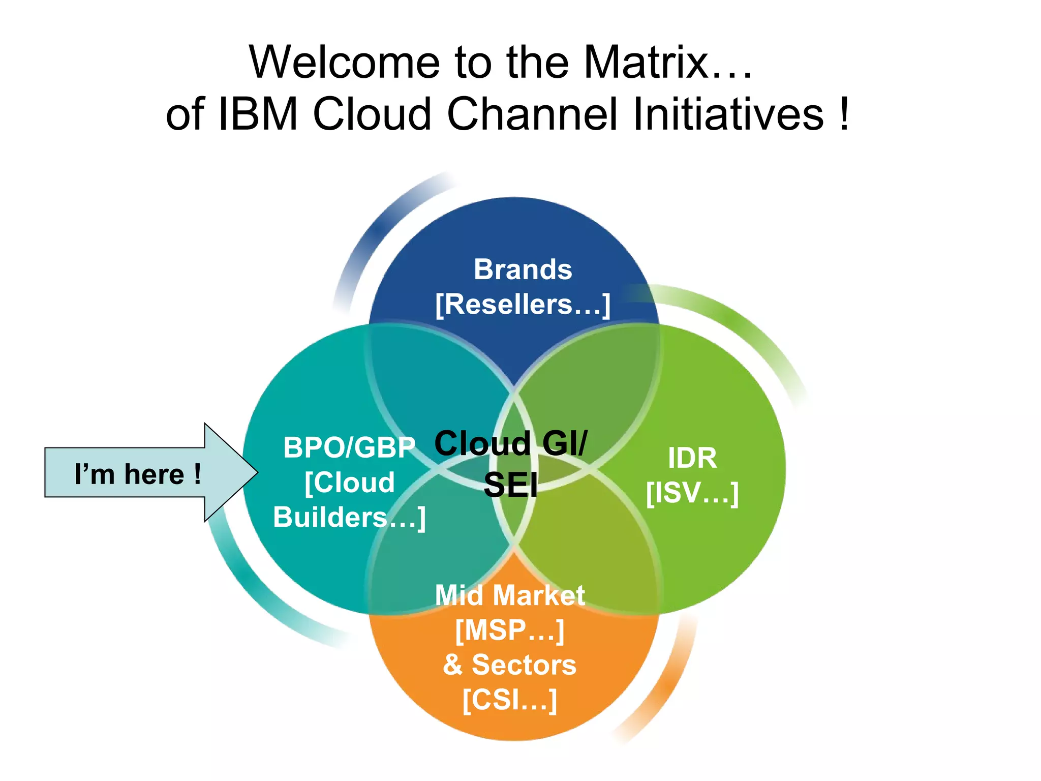 The document outlines IBM's cloud partner ecosystem, emphasizing the variety of roles partners can play, including cloud builders, infrastructure providers, application providers, services solution providers, and technology providers. It highlights the importance of partnership for both IBM and its business partners in leveraging cloud capabilities, driving innovation, and enhancing business value. Additionally, it provides guidance on engaging partners and developing cloud-related business opportunities through structured workshops and strategic planning.