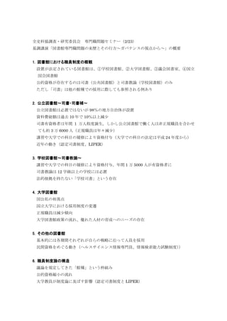 設置が法定されている図書館は、①学校図書館、②大学図書館、③議会図書室、④国立 国会図書館 公的資格が存在するのは司書(公共図書館)と司書教諭(学校図書館)のみ ただし「司書」は他の館種での採用に際しても参照される例あり 2. 公立図書館~司書・司書補~ 公立図書館は必置ではないが 98%の地方自治体が設置 資料費総額は過去 10 年で 10%以上減少 司書有資格者は年間 1 万人程度誕生。しかし公立図書館で働く人は非正規職員を合わせ ても約 3 万 6000 人(正規職員は年々減少) 講習や大学での科目の履修により資格付与(大学での科目の法定は平成 24 年度から) 近年の動き(認定司書制度、LIPER) 3. 学校図書館~司書教諭~ 講習や大学での科目の履修により資格付与。年間 1 万 5000 人が有資格者に 司書教諭は 12 学級以上の学校には必置 法的根拠を持たない「学校司書」という存在 4. 大学図書館 国公私の相異点 国立大学における採用制度の変遷 正規職員は減少傾向 大学図書館政策の流れ、優れた人材の育成へのニーズの存在 5. その他の図書館 基本的には各期間それぞれが自らの戦略に沿って人員を採用 民間資格をめぐる動き(ヘルスサイエンス情報専門員、情報検索能力試験制度) ) 6. 職員制度論の構造 議論を規定してきた「館種」という枠組み 公的資格縮小の流れ 大学教員が制度論に及ぼす影響(認定司書制度と LIPER)