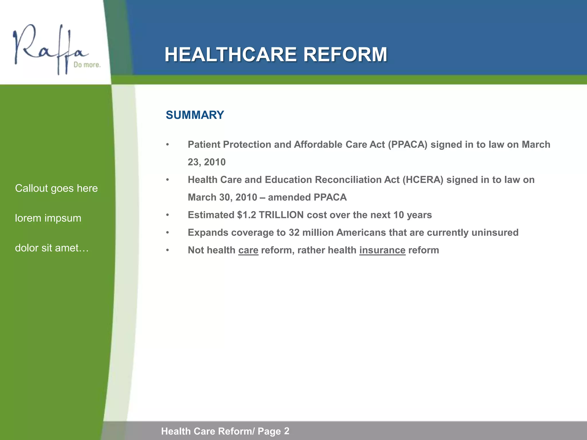 This document summarizes key provisions and changes to US healthcare reform under the Patient Protection and Affordable Care Act (PPACA) and Health Care and Education Reconciliation Act (HCERA) over several years, including mandating health insurance coverage, establishing health insurance exchanges, increasing penalties for uninsured individuals, and imposing penalties on some employers. Key points include expanding coverage to 32 million uninsured Americans at an estimated cost of $1.2 trillion over 10 years, eliminating pre-existing condition limitations for all by 2014, and requiring most Americans to have health insurance or pay a penalty by 2014.