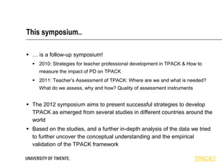 The 2012 TPACK symposium focused on developing strategies for teacher professional development in technology integration across various countries. Presentations explored the assessment of TPACK competencies, highlighting differences between self-reported knowledge and actual outcomes, and emphasized the need for practical, hands-on learning experiences. Insights from studies in Ghana and Tanzania demonstrated the positive impact of technology on teaching practices and student engagement.