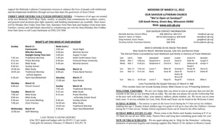 The document announces several upcoming events at a church, including a dinner on March 24th with food and music, youth activities like tie-dyeing on March 31st, and volunteer opportunities such as helping at a thrift shop. It also provides notices about Lenten services and suppers, donations needed for various projects, and enrollment for preschool. Various groups like Chicks with Stix are mentioned as well as opportunities for giving through programs like buying Scrip.