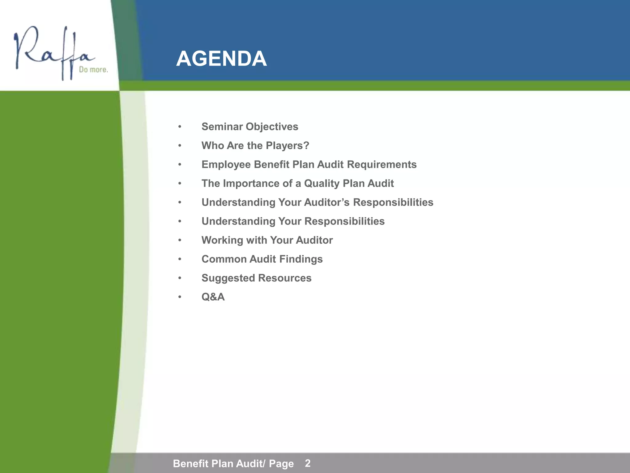 This document provides an overview of preparing for an employee benefit plan audit. It discusses who the key players are in a benefit plan audit, including the sponsor, participants, trustee, plan administrator, custodian and service providers. It outlines the audit requirements for different types of benefit plans and discusses topics like understanding the auditor's responsibilities, internal controls, common audit findings and working with the auditor. The overall goal is to help plan administrators better understand the audit process and make the audit more efficient.