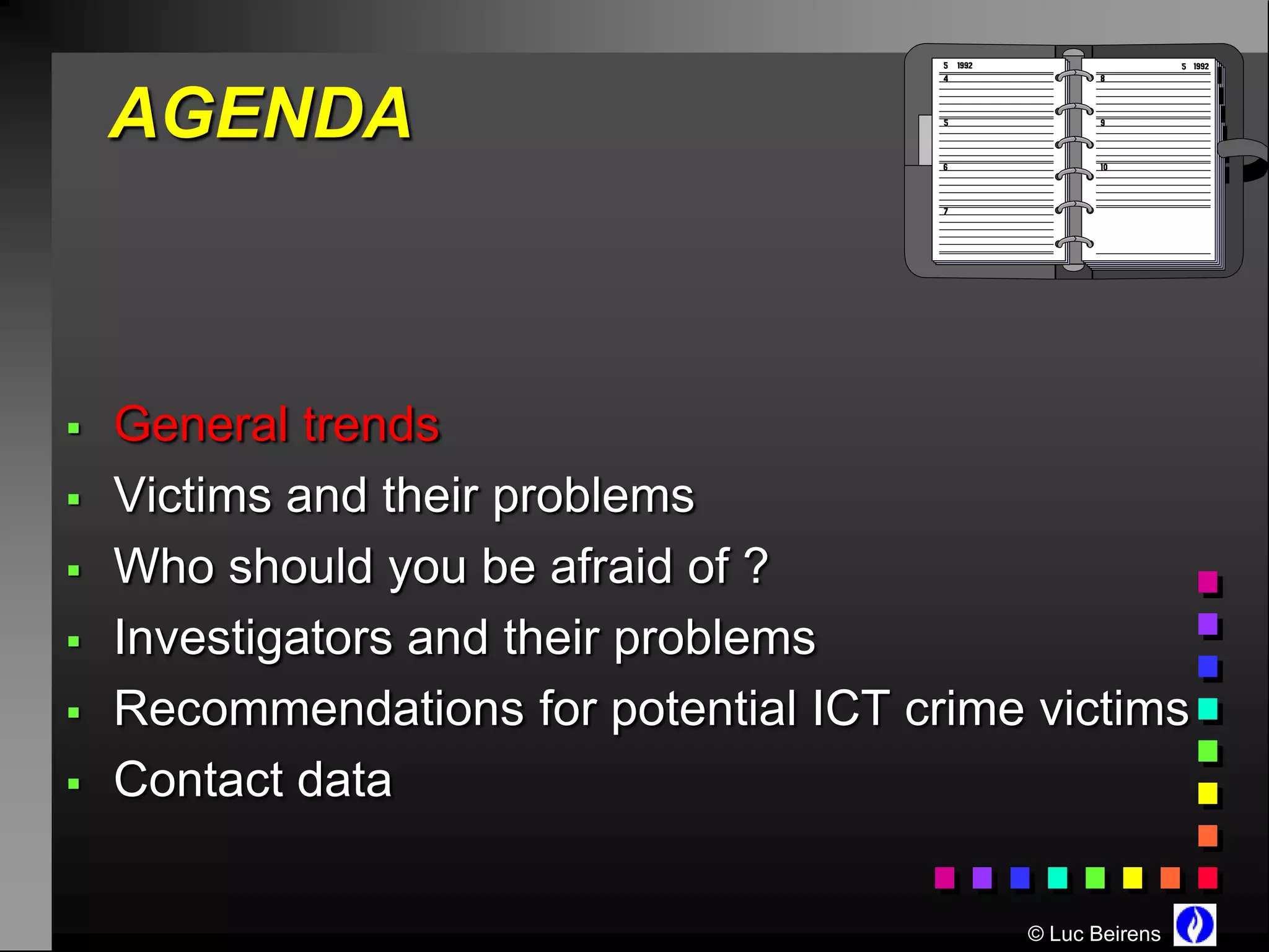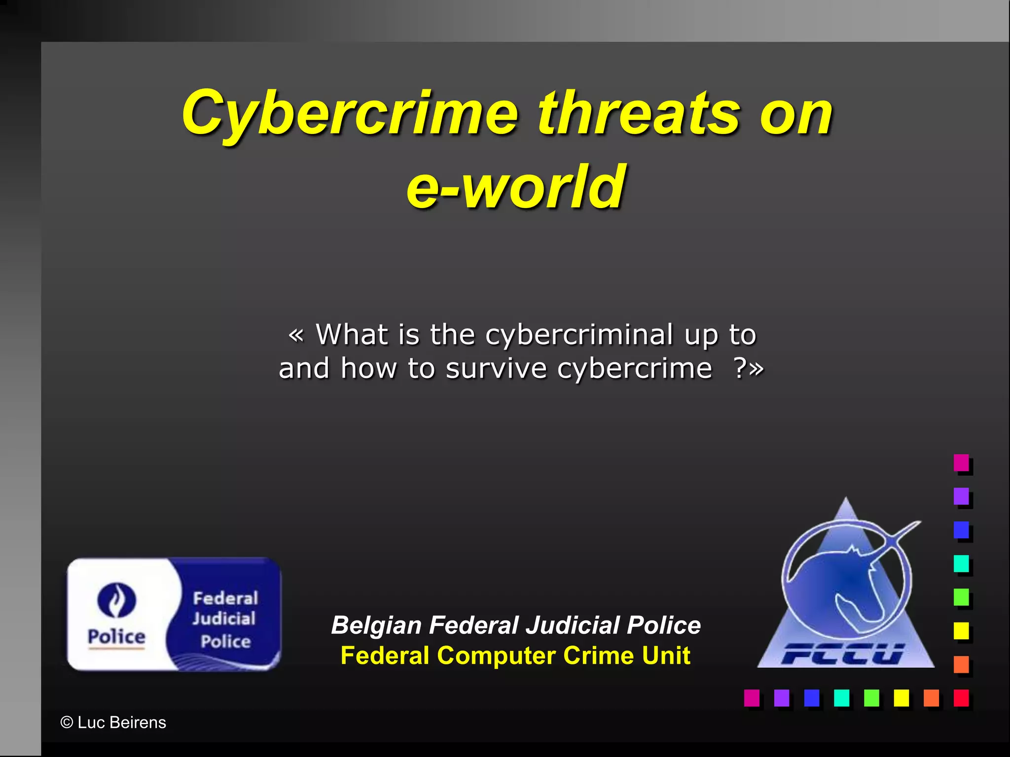 The document discusses the rise of cybercrime in the modern e-society, highlighting various trends, potential victims, and the motivations behind cybercriminal activities. It emphasizes the importance of ICT security, the challenges faced by investigators, and the need for organizations and individuals to understand their vulnerabilities. Recommendations for preventing and responding to cybercrime incidents are also provided, along with contact information for law enforcement resources.