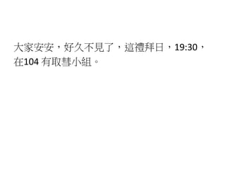 大家安安,好久不見了,這禮拜日,19:30, 在104 有取彗小組。