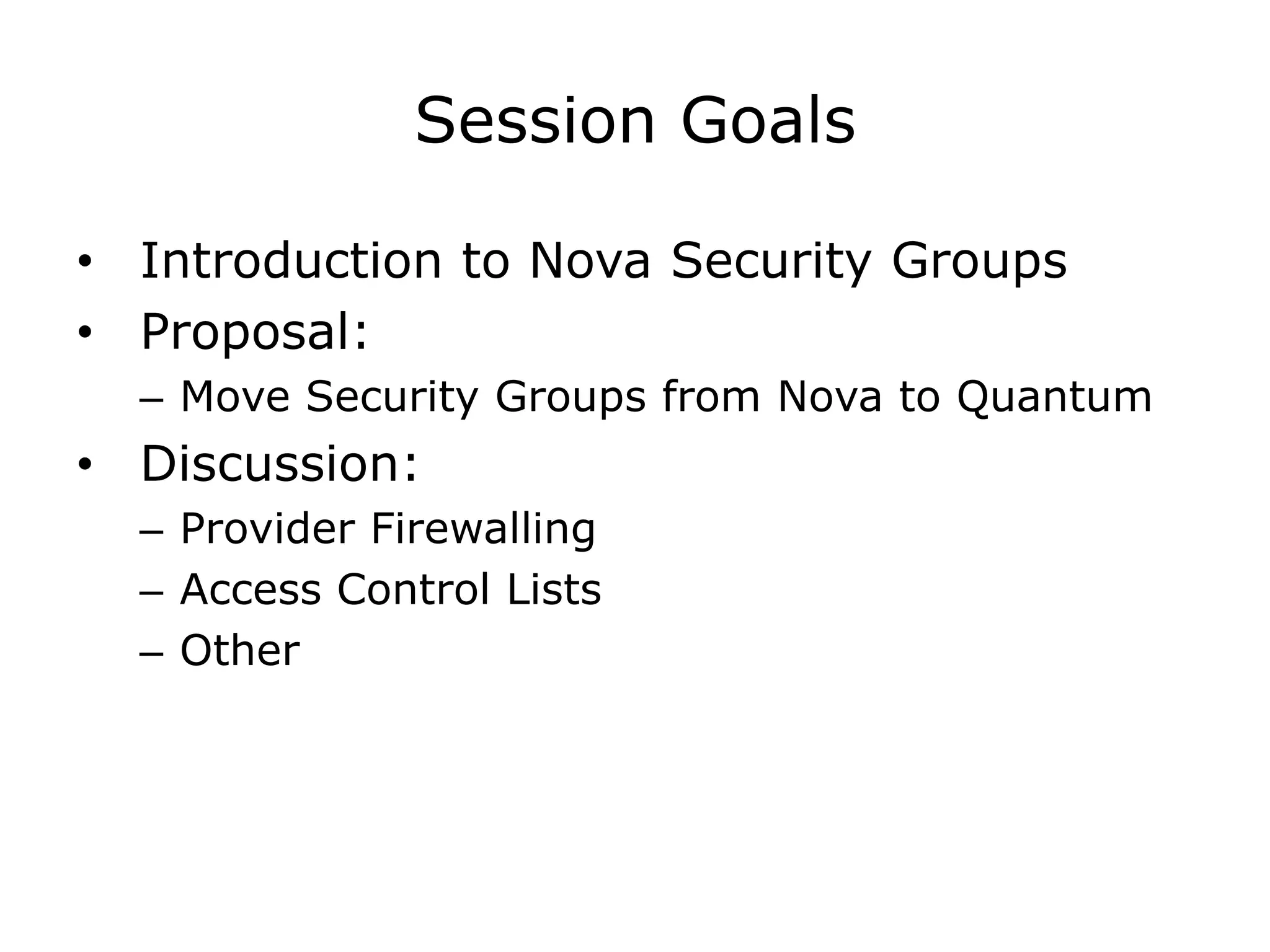 The document discusses the proposal to transition security groups from Nova to Quantum within the OpenStack framework, highlighting the differences and improvements in security group features and APIs. Key points include the current model's limitations, proposed enhancements for firewall capabilities, and the introduction of per-port security group associations. The session aims to facilitate a discussion on access control lists, provider firewalling, and user modifications to security groups.