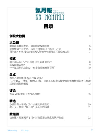本文概述了2012年5月的一些科技与创业趋势,包括苹果的触控技术和手写笔专利,Google无人驾驶汽车的应用,以及iHeartRadio快速增长的用户群。此外,文章还介绍了俄罗斯公司为打击盗版而研发的技术和复旦大学学生创办的有毒食品信息网站,展示了创业者对市场需求的回应和创新。
