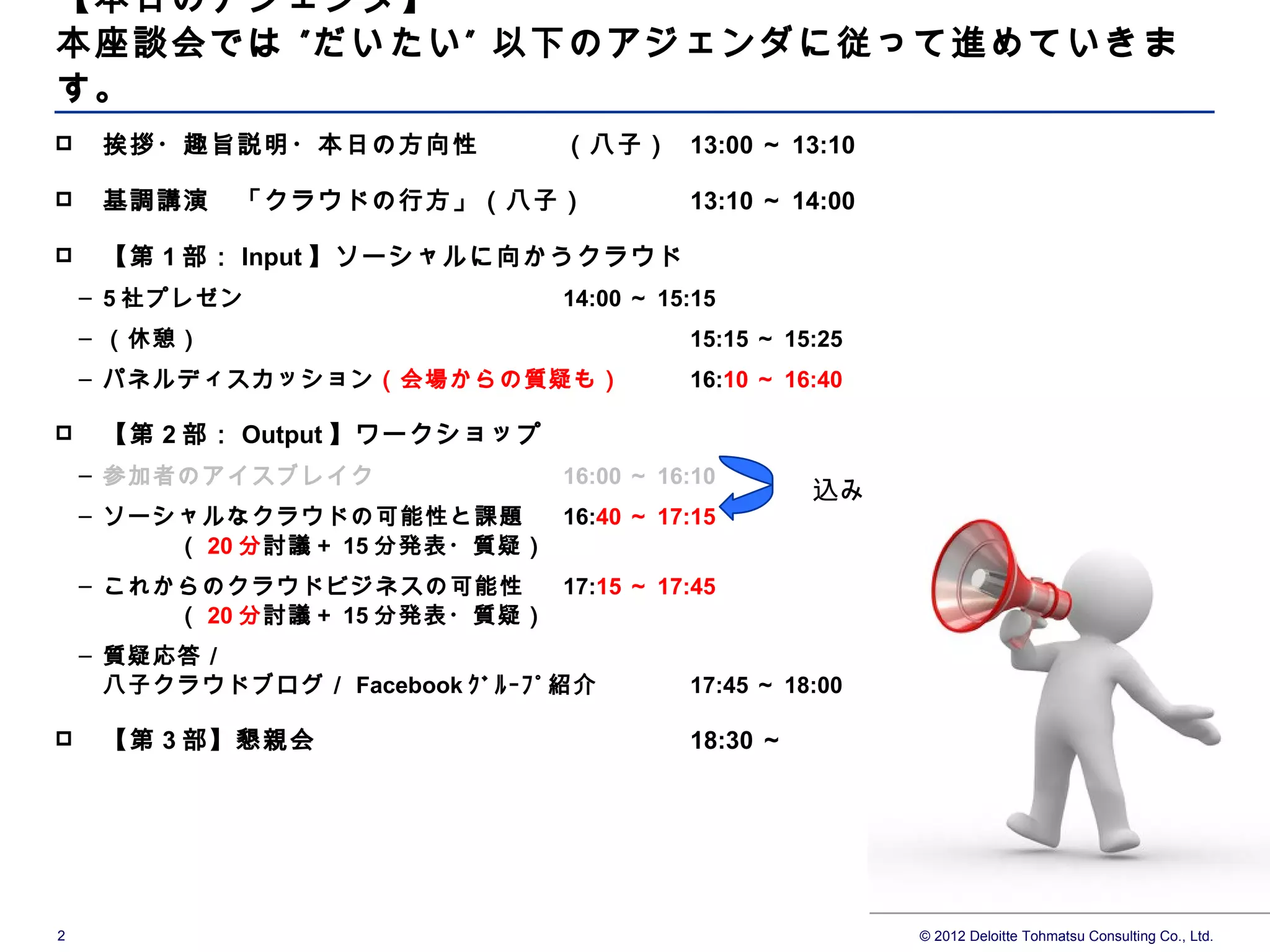 ” 以下のアジェンダに従って進めていきま す。 挨拶・趣旨説明・本日の方向性 (八子) 13:00 ~ 13:10 基調講演 「クラウドの行方」(八子) 13:10 ~ 14:00 【第 1 部: Input 】ソーシャルに向かうクラウド – 5 社プレゼン 14:00 ~ 15:15 – (休憩) 15:15 ~ 15:25 – パネルディスカッション(会場からの質疑も) 16:10 ~ 16:40 【第 2 部: Output 】ワークショップ – 参加者のアイスブレイク 16:00 ~ 16:10 込み – ソーシャルなクラウドの可能性と課題 16:40 ~ 17:15 ( 20 分討議+ 15 分発表・質疑) – これからのクラウドビジネスの可能性 17:15 ~ 17:45 ( 20 分討議+ 15 分発表・質疑) – 質疑応答/ 八子クラウドブログ/ Facebook グループ紹介 17:45 ~ 18:00 【第 3 部】懇親会 18:30 ~ 2 © 2012 Deloitte Tohmatsu Consulting Co., Ltd.
