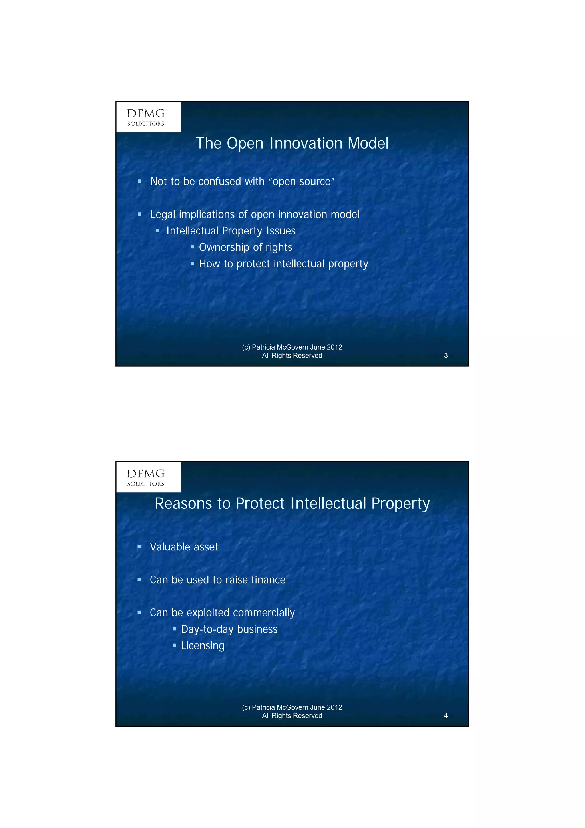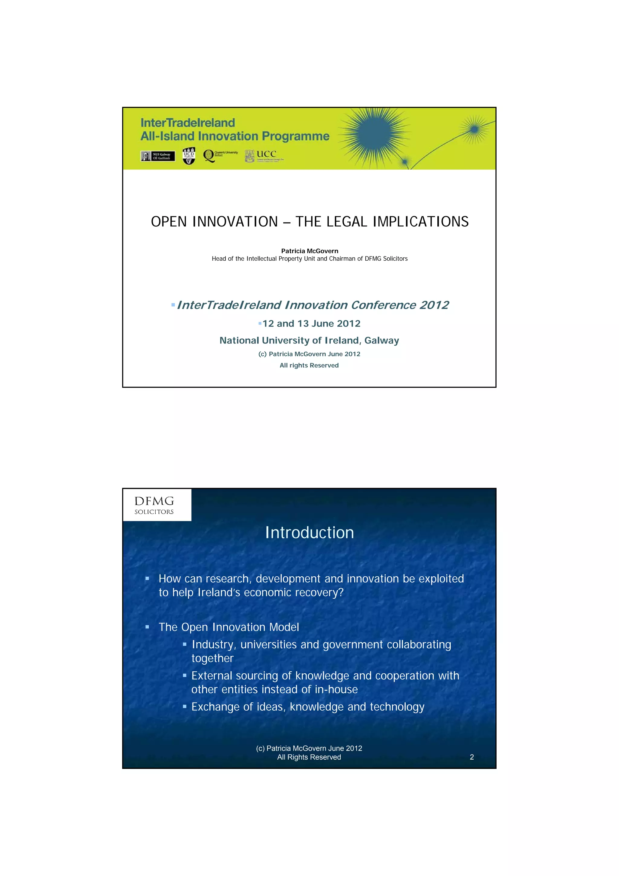 The document discusses the open innovation model, emphasizing collaboration between industry, universities, and government to enhance Ireland's economic recovery, while addressing the legal implications and intellectual property (IP) concerns associated with it. It outlines the importance of protecting IP, which can be valuable assets for businesses, and provides guidelines for registration and enforcement. Furthermore, it highlights the challenges of IP management, such as counterfeiting, and the role of government in facilitating a conducive environment for innovation.