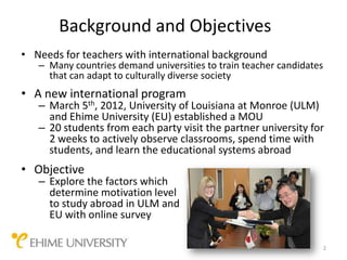 1) The document summarizes the results of an online survey exploring factors that determine willingness to study abroad in teacher training programs between the University of Louisiana at Monroe (ULM) and Ehime University (EU) in Japan.